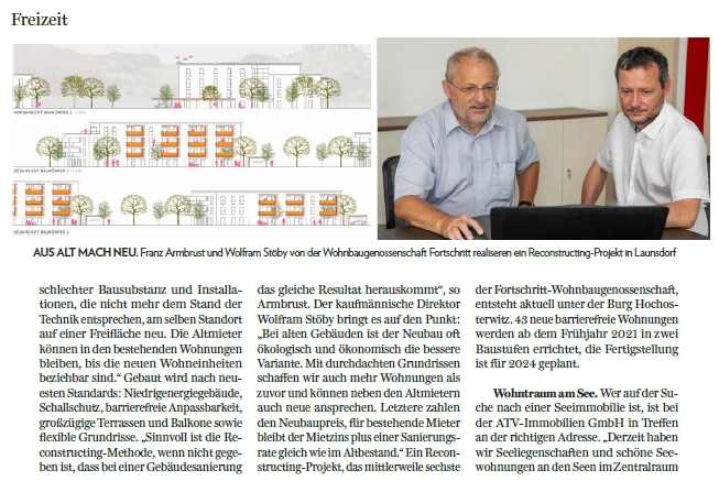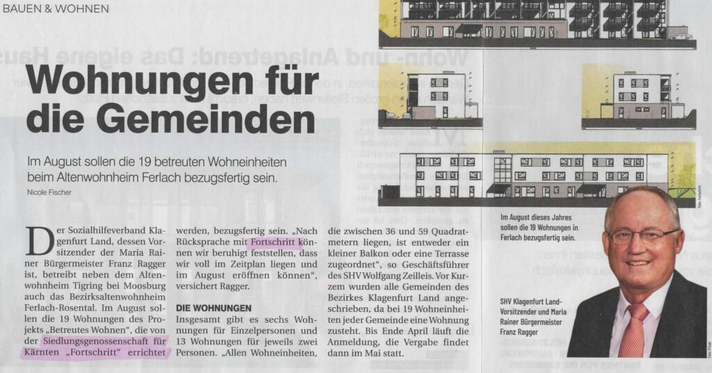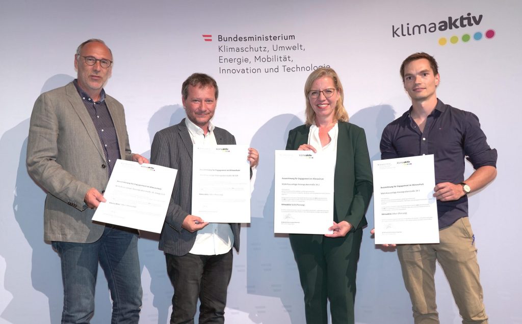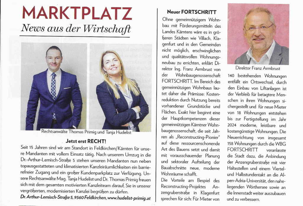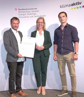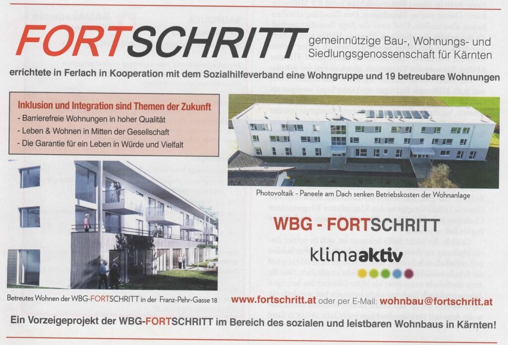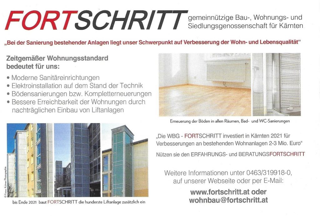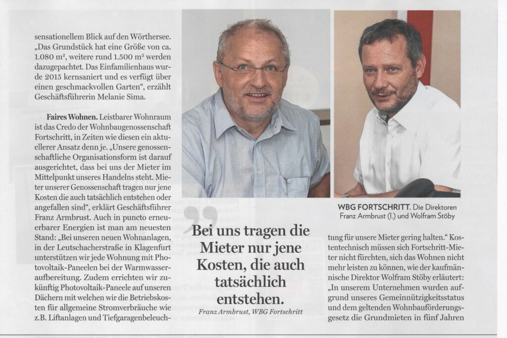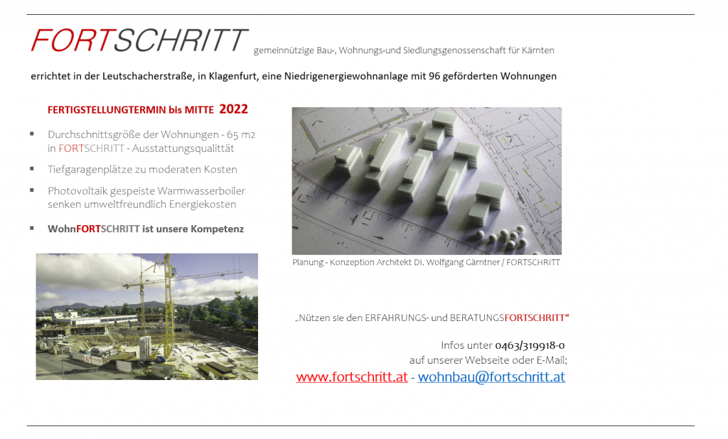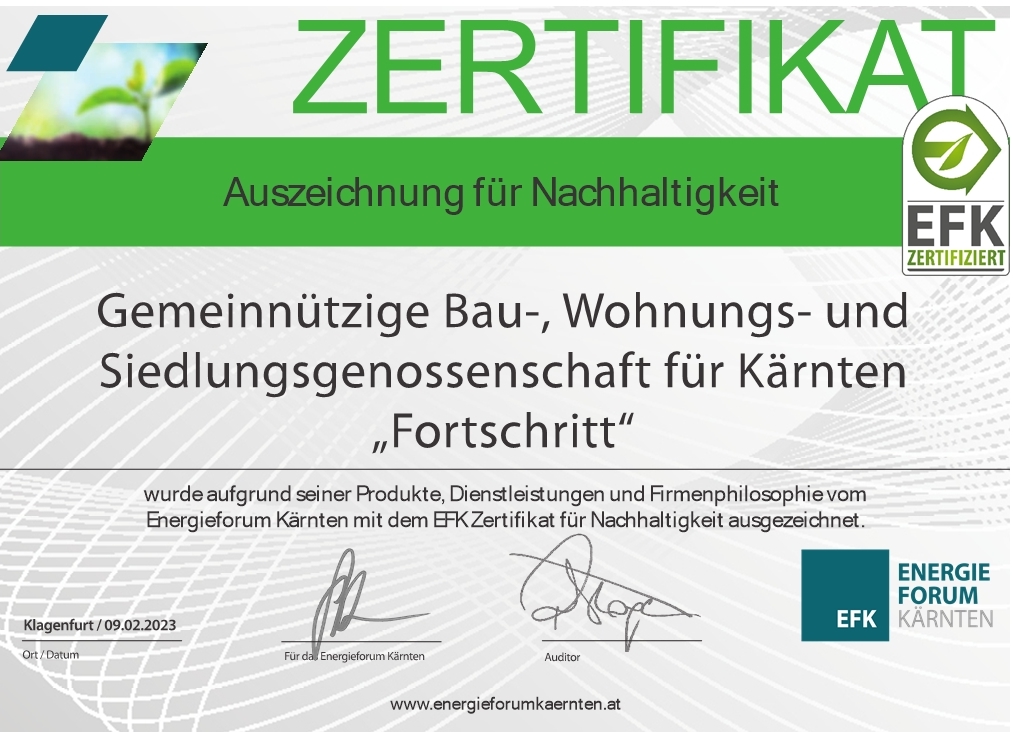 Die gemeinnützige Wohnbaugenossenschaft FORTSCHRITT wurde vom Energieforum Kärnten ausgezeichnet. Der Vorzeigebetrieb erhielt kürzlich das EFK Zertifikat, eine Auszeichnung des Energieforums Kärnten, die nur nachhaltige Unternehmen und ihre Produkte erhalten können. Das Energieforum Kärnten zeichnet Unternehmen, sowie deren Produkte unter dem Aspekt der Nachhaltigkeit aus. Das betrifft Themen wie Energieeffizienz, Ressourcenschonung, Gesundheit, Umweltverträglichkeit, aber auch regionale Wertschöpfung. Die Zertifizierung erfolgt im Rahmen eines standardisierten und geprüften Verfahrens und wird in individuell festgelegten Zeiträumen erneuert. Durch die fachliche Kompetenz, Unabhängigkeit und höchster Integrität der Mitarbeiter wird die hohe Qualität der Auszeichnung und die damit verbundene Glaubwürdigkeit gegenüber Konsumenten, Unternehmen und Partnern garantiert. Ziel ist es, viele Unternehmen auf den Weg zu einer nachhaltigen Ausrichtung zu begleiten und damit einen Beitrag zu Ökologisierung und Effizienzsteigerung zu leisten. Die “FORTSCHRITT“ mit Sitz in Klagenfurt ist eine gemeinnützige Wohnbaugenossenschaften, die seit 1951 Gebäude errichtet und verwaltet. Mit einem Wohnungsbestand von ca. 4500 in etwa 160 Objekten zählt die „FORTSCHRITT“ zu den wichtigen gemeinnützigen Wohnbaugesellschaften des Landes. Die Geschäftsführung unter der Leitung von BM Ing. Tobias Schmerlaib und Wolfram Stöby forciert das Thema Nachhaltigkeit im Unternehmen. Ökologisches und hochwertiges Bauen im Einklang mit sozialem Wohnen sind wesentliche Bestandteile der Firmenphilosophie. Im Neubau orientiert man sich an den Klimaaktiv Standards und bei der Sanierung wählt man oft die mieterfreundliche Variante des Rekonstructings. Themen, wie Photovoltaik oder Versorgung mit erneuerbarer Energie werden konsequent umgesetzt. Das mehrfach ausgezeichnete Unternehmen hat viele Leuchtturmprojekte im mehrgeschossigen Wohnbau verwirklicht. Auch im eigenen Betrieb wird auf ökologische Nachhaltigkeit großen Wert gelegt. Energetische Maßnahmen, wie die Dämmung der Gebäudehülle, die Umstellung auf LED-Beleuchtung haben den eigenen Energieverbrauch erheblich gesenkt. Man bezieht Ökostrom und für die Wärmegewinnung werden nachwachsende Brennstoffe verwendet. Alle Leistungen werden so weit als möglich im direkten Umfeld bezogen, um die regionale Wertschöpfung sicherzustellen. Strikte Mülltrennung gehört ebenfalls zur Nachhaltigkeitsstrategie. Auch in den Bereichen der ökonomischen und sozialen Nachhaltigkeit konnten beim durchgeführten Audit Höchstwerte erzielt werden. Das Unternehmen kann als besonders mitarbeiterfreundlich bezeichnet werden. Das EFK Zertifikat ist als Orientierungshilfe für den „bewusst einkaufenden“ Konsumenten gedacht. Betriebe, die ausgezeichnet werden, werden langfristig vom Energieforum Kärnten begleitet, um die nachhaltige Entwicklung sicherzustellen. Übrigens werden alle ausgezeichneten Betriebe auf www.energieforumkaernten.at/zertifiziertepartner präsentiert