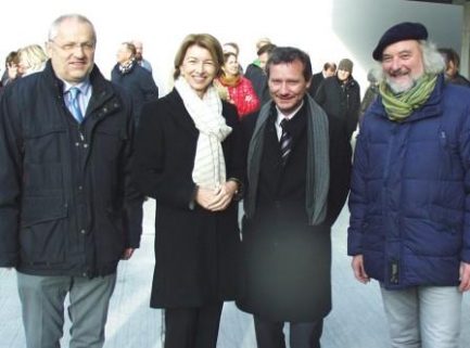v.l.n.r. Dir. Ing. Franz Armbrust, Dir. Wolfram Stöby “FORTSCHRITT”, NR-Abgeordneter Philip Kucher, Bauleiter Ing. Gerd Moser, Bmstr. DI. Markus Riegler, zwei Mieterinnen, Architekt Roland Omann